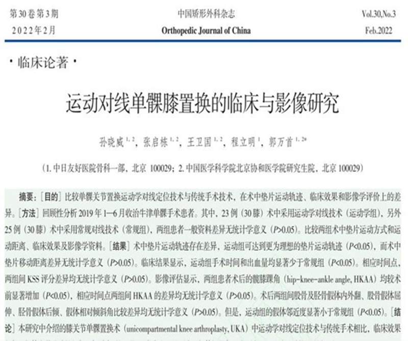 本文中介绍的UKA 术中运动学对线定位技术,与传统手术相比,临床结果相似,假体安装准确性相似,术中不打通股骨髓腔(髓外定位技术),减少了因开髓而导致的手术时间延长出血量,假体间的邻近度更小,且改善了垫片运动轨迹使其更为理想,减少脱位及内侧撞击疼痛。