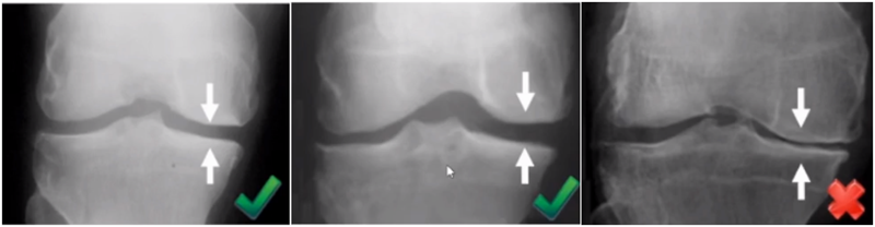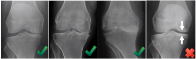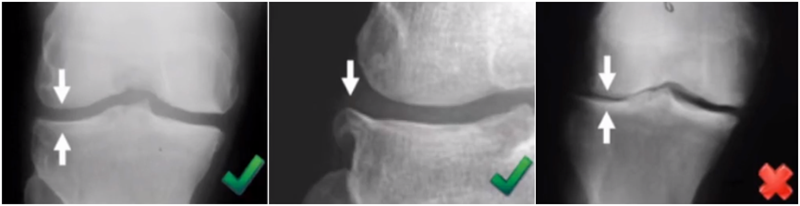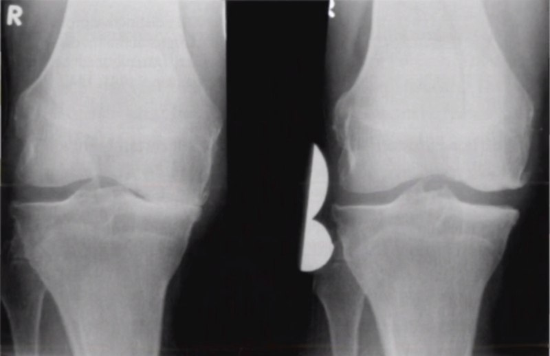 牛津单髁影像学判断的标准为通过负重正位片来判断内侧间室关节软骨的磨损程度。内侧间室关节间隙变窄,股骨内侧髁与内侧胫骨平台成“骨磨骨”状态,说明内侧间室软骨磨损丢失。如果没有在正位片观察到“骨磨骨”,则需要通过内翻应力位片或rosenberg位检查,找到骨磨骨的证据。如果以上均没有显示骨磨骨,需考虑关节镜检查,只有在达到“骨磨骨”的情况下才考虑行UKA。