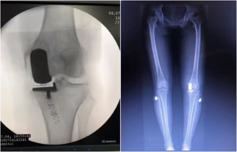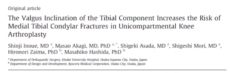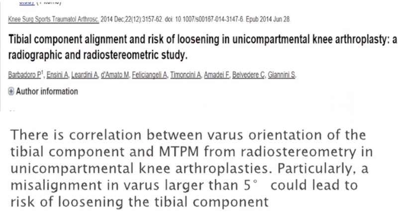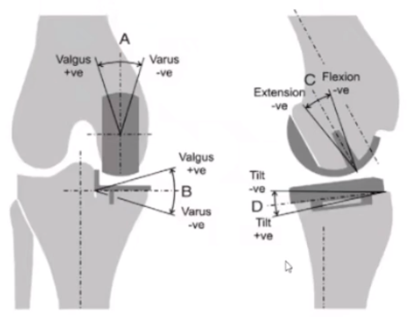 文献中建议假体内外翻不大于4°,如果假体出现外翻,后倾大,会造成内侧皮质压力异常增高,增加内髁骨折风险。如果假体内翻超过5°,增加胫骨平台松动风险。