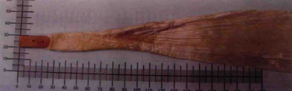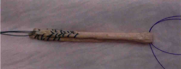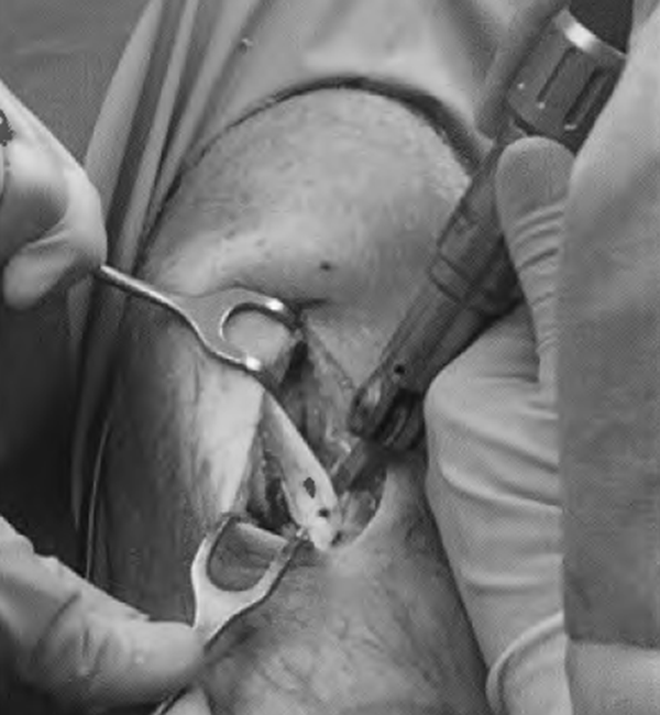 沿髌骨下极中线稍偏内侧切开皮肤,解剖皮下并识别腱周组织。锐性切开腱周组织并牵开,暴露髌腱。从髌腱中央切取宽9~ 11mm,长为髌腱全长的腱。使用摆锯和骨凿,在胫骨和髌骨上均取长20-30mm的骨栓。