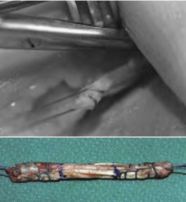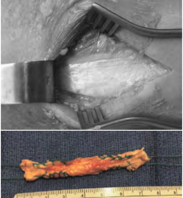 然而,自体肌腱移植物获取可能出现供腱区并发症,这是其一个明显的缺点。此外,自体移植取腱带来的皮肤及软组织切口增加、增长以及切骨等创伤会使原本受伤的组织遭受更大的创伤。