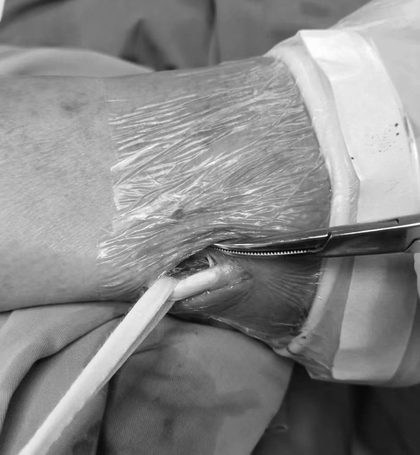 外踝后方5mm做切口,显露腓骨长短肌腱,腓骨长肌腱位于短肌腱前外侧。