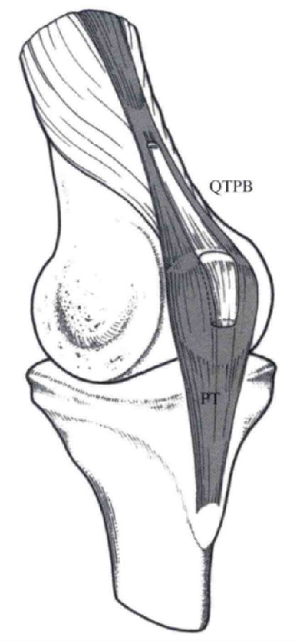 自体QTB与BPTB供区有类似的并发症,但程度稍轻,主要包括髌骨骨折风险、取腱时进入髌上囊造成膝关节内压力丢失的风险、移植物刚度低及术后股四头肌力量下降。