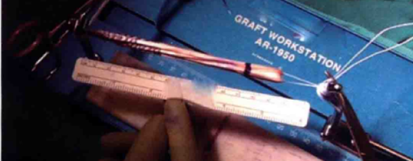 通过髌骨上极延伸的正中纵向切口可获取股四头肌腱移植物。通过皮下组织解剖,分离并保护髌骨支持带。确定近端的股四头肌腱及其与股内侧肌斜束和股外侧肌斜束的连接部位。在股四头肌腱上测量所需的肌腱移植物的宽度和长度。通过股四头肌腱全层或者部分层面做切口,注意保留肌腱的关节面和周围滑膜、髌骨上极硬化的骨质也是非常重要的。获取移植物时可带有髌骨上极骨栓,也可以不带。