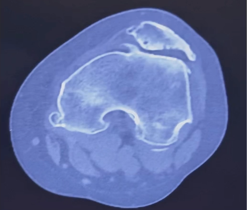 术前CT显示:髌骨与股骨外髁形成关节,周边有大量骨赘,软骨已经硬化,并伴有囊变。