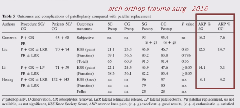第四点,现有论文缺乏单独的髌骨成形术与髌股关节置换术治疗髌股关节炎临床疗效的对比研究。应用关键词“全膝关节置换术”“髌骨成形术”进行英文文献回顾筛选。在选择的7篇文献中,TKA+髌骨成形术与TKA+髌骨置换术患者膝前痛结果进行对比,结果富有争议,表明效果相当。