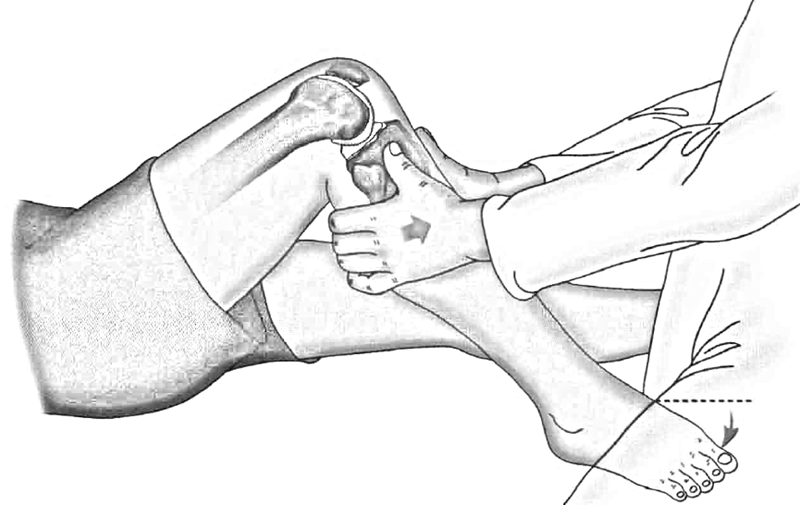 Slocum试验,在膝关节PMC正常的情况下,外旋位较中立位PMC紧张,胫骨前移幅度减小。在PMC损伤的情况下,外旋位胫骨前移幅度反而加大,有胫骨内侧平台向前脱位的感觉,此即为Slocum试验阳性,适用于膝关节内侧结构慢性损伤后失稳的检查。