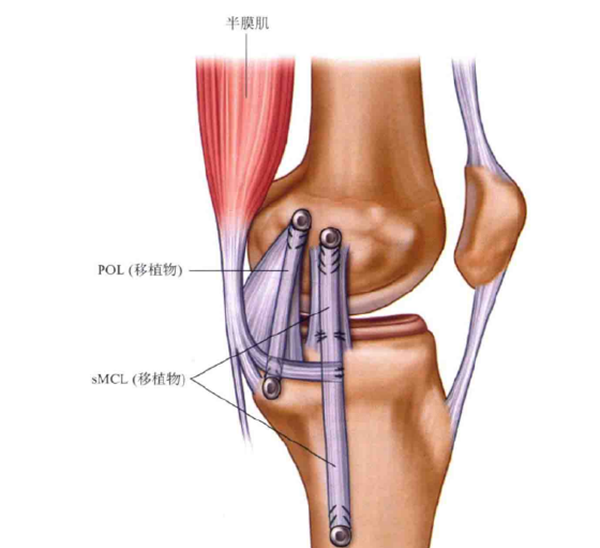 手术治疗分为韧带修复和韧带重建,韧带修复包括MCL损伤部位的锚钉缝合、股骨端止点原位修补和PMC的加强修复(用锚钉将MCL近端与POL缝合在一起)。