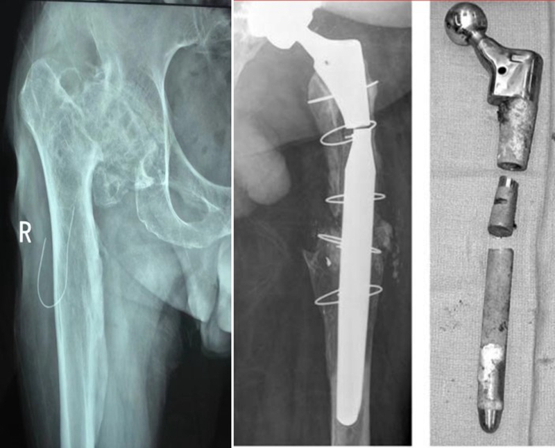 缺点:①骨折——截骨两端捆钢丝;②截骨端不稳定,术后骨折不愈合——足够长的远端固定型非骨水泥型假体或组配型假体,假体长度足够,避免型号过小,必要时使用骨板加强固定;③失血多、时间长。