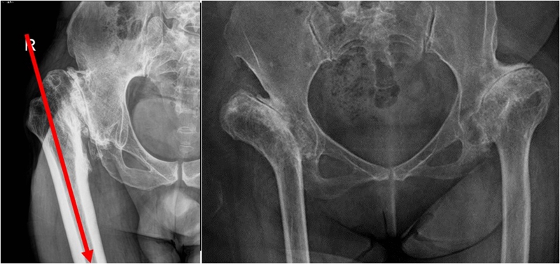 导致股骨近端畸形的原因主要有原发型和继发型两大类。原发型多为发育异常所致(DDH)、代谢性骨病、强直性脊柱炎引起;继发型主要为手术所致,包括股骨近端截骨术、股骨近端骨折内固定术、全髋或半髋置换,其他因素如感染、创伤畸形愈合等。