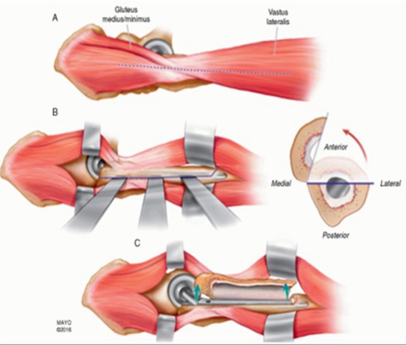 优点:不改变股骨近端的解剖,保持臀中肌附丽点完整,截骨后能矫正股骨的前倾角,是较为理想的股骨缩短方法。