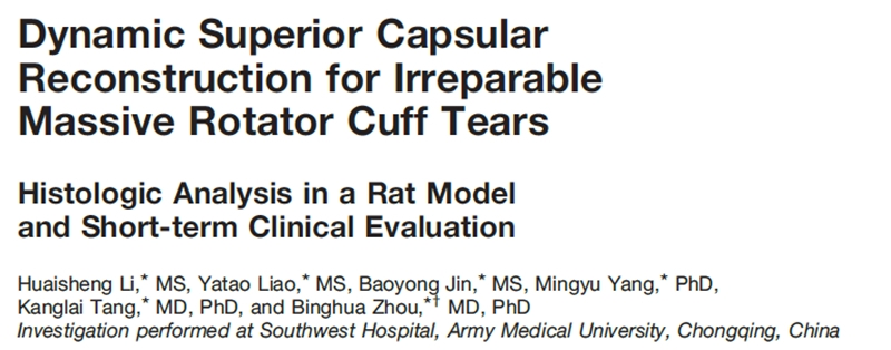 2023年3月,陆军军医大学西南医院运动医学中心周兵华副教授团队在运动医学顶级期刊American Journal of Sports Medicine(IF:7.010 中科院分区:医学1区Top)上发表题为 “Dynamic Superior Capsular Reconstruction for Irreparable Massive Rotator Cuff Tears - Histologic Analysis in a Rat Model and Short-term Clinical Evaluation”的研究成果。