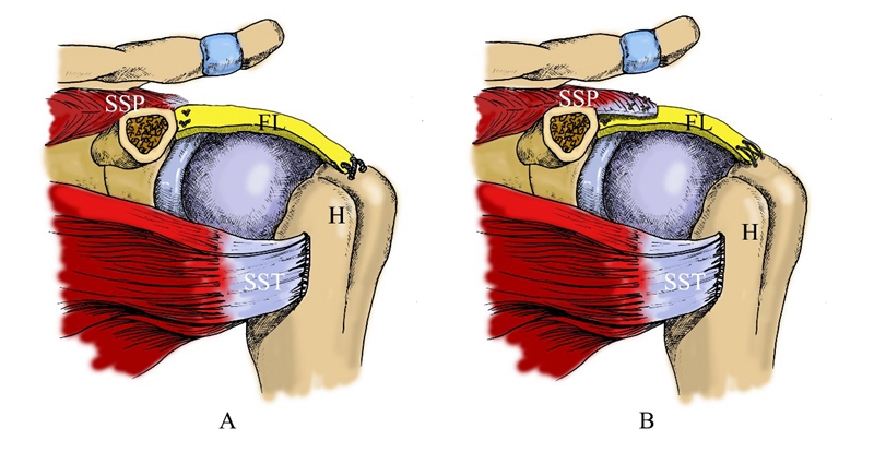 动力化上关节囊重建(B)是在传统上关节囊重建(A)基础上,将残留的冈上肌腱(SSP)末端缝合至阔筋膜(FL)中部