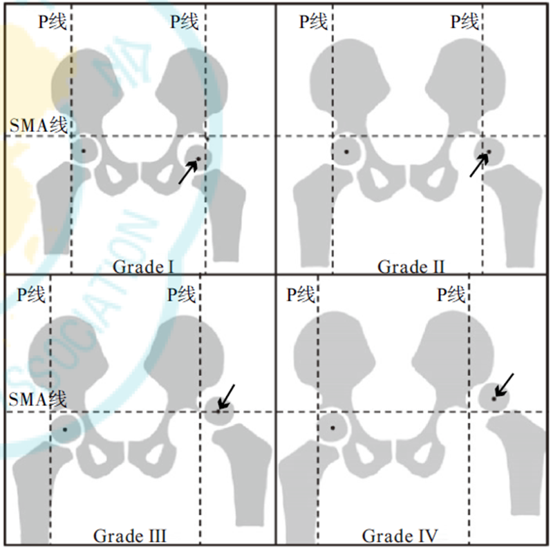 Tönnis分型是基于股骨头骨化核与髋臼的相对位置进行分型:过髋臼外上缘作双侧髋臼外上缘连线(SMA)的垂线为Perkins线(P线),SMA线与P线垂直相交形成四个象限。股骨头骨化核位于内下象限为Ⅰ度、位于外下象限为Ⅱ度、与SMA线接触为Ⅲ度、位于外上象限为Ⅳ度(图1)。