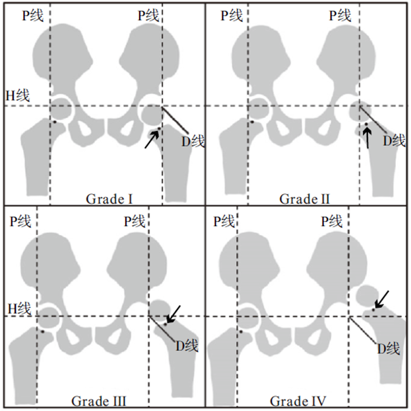 IHDI分型是基于股骨近端干骺端中心与髋臼相对位置的分型系统:双侧Y形软骨上方髂骨下缘的连线为Hilgenreiner’s线(H线),过髋臼外上缘做Hilgenreiner’s线的垂线为Perkins线(P线),二者构成的外下象限的角平分线为D线。股骨近端干骺端中点位于P线的内侧或P线上为Ⅰ度、位于P线之外但不超过D线之间为Ⅱ度、位于D线之外但不超过H线之间为Ⅲ度、位于H线之上为Ⅳ度(图2)。