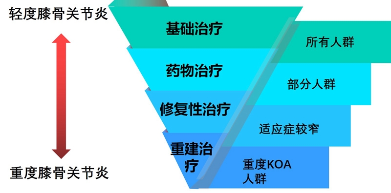 《骨关节炎诊治指南(2018年版)》首次提出的OA阶梯化与个体化的治疗方案,目的在于改善症状、提高生活质量、延缓疾病进展,并避免过度治疗,使处于不同疾病阶段和程度的OA患者获得最适合自身病情的治疗方案。阶梯化治疗方案包括基础治疗、药物治疗、修复性手术治疗及重建手术治疗。