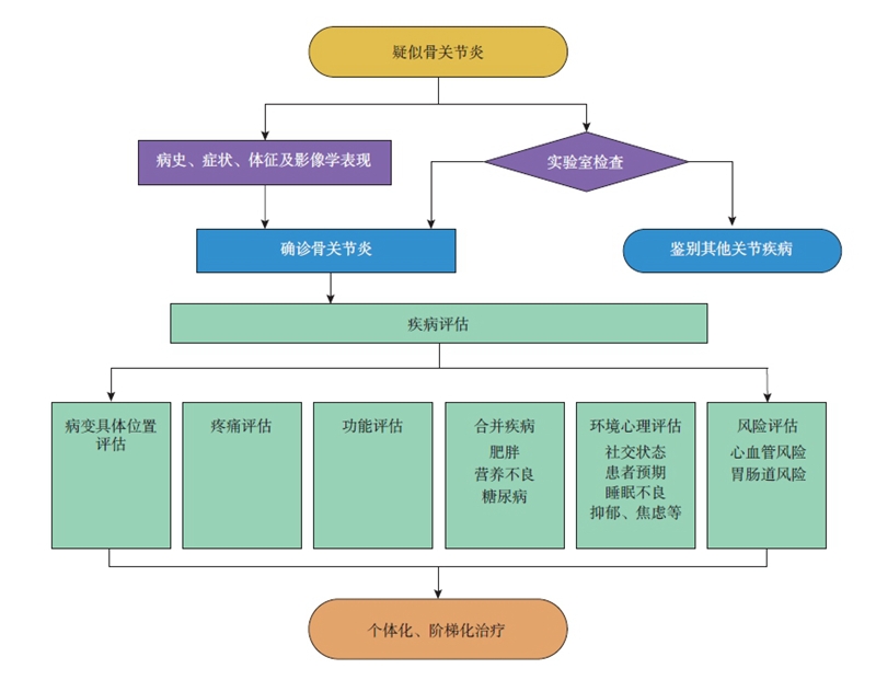 临床医生应依据患者年龄、性别、体质指数(BMI)、病变部位及程度等采用阶梯化与个体化治疗方案,以达到减轻疼痛、改善或恢复关节功能、提高患者生活质量、延缓疾病进展和矫正畸形的目的。