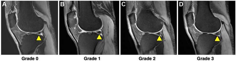 MRI分级,A:0级信号,正常外侧半月板(箭头所示)无退行性改变或撕裂,T2加权MRI显示半月板内无信号。B:Ⅰ级信号,MRI上缘不规则信号(箭头),信号不与上、下关节半月板面相通。但在关节镜下,外侧半月板后角是正常的。C:Ⅱ级板信号,MRI上以线状信号(箭头)为主。D: Ⅲ级信号,半月板(箭头)内的主要线性信号强度,信号紧贴关节面