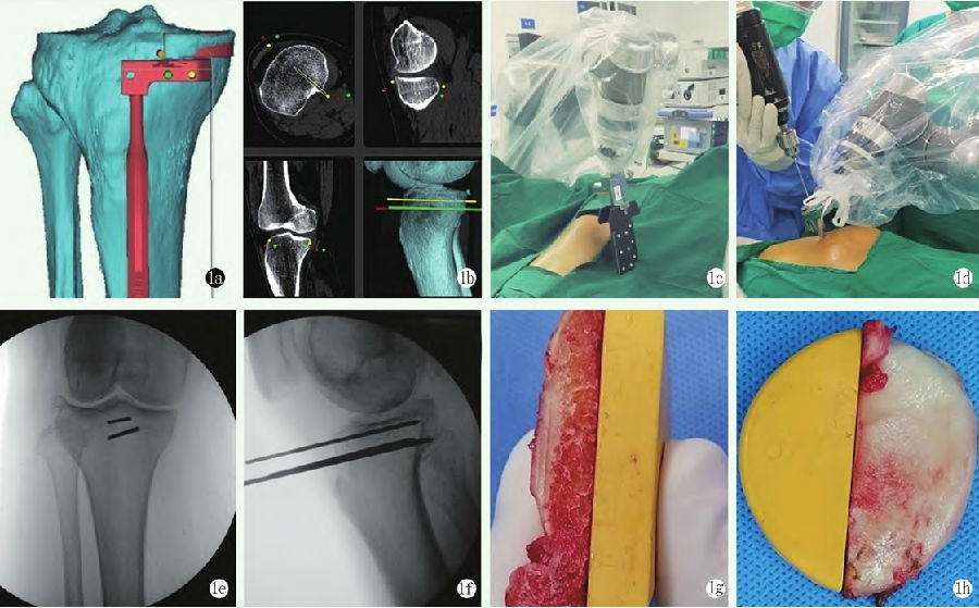 1a:术前MIMICS上规划匹配假体,模拟放置胫骨假体及截骨导向器;1b:在导引系统中规划克氏针通道位置;1c:C形臂X线机结合机械臂,摄片校准图像;1d:在导引系统中进行多模态图像融合,将信号传输到激光定位操作平台,引导机械臂置入克氏针;1e, 1f:待3枚克氏针置入后,再次进行C形臂X线机透视,确定克氏针位置与术前规划一致;1g, 1h:术中根据克氏针位置进行胫骨精准截骨