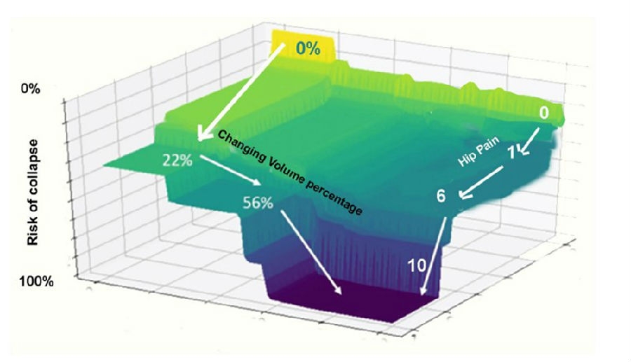 图3 基于骨坏死体积百分比和髋关节疼痛重要性的塌陷风险表面图