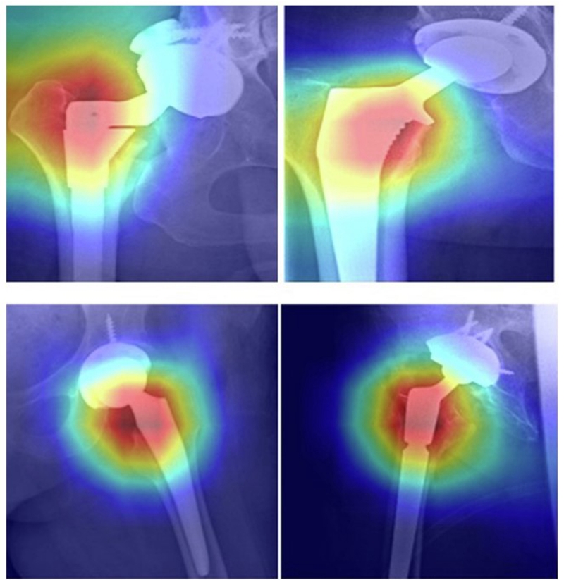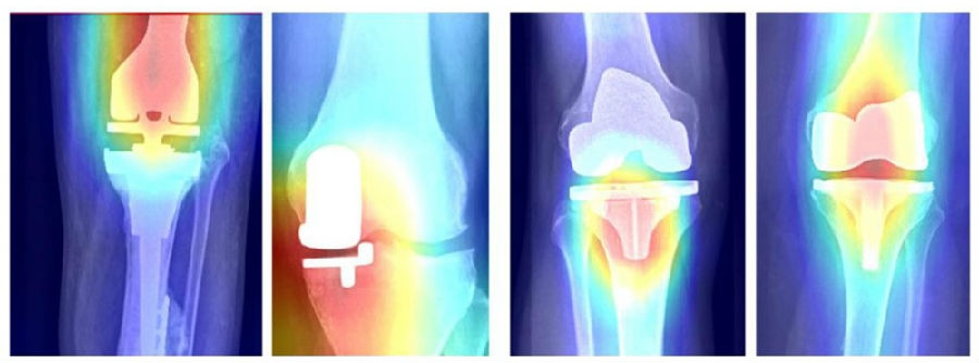 图4 膝关节假体的样本热图,说明人工智能模型的识别重点