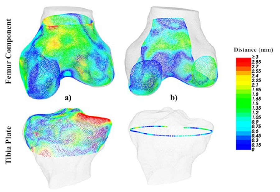 图8 股骨组件(上排)和胫骨板(下排)的最大OUH计算