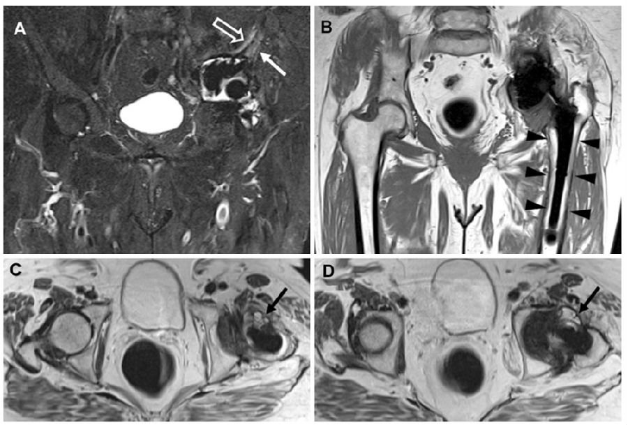 冠状STIR(A)显示假体周围髋臼骨水肿(白色箭头)和囊外水肿(空心箭头)。冠状T1加权图像(B)中未发现骨破坏。轴位T2加权图像(C和D)显示炎症和滑膜炎