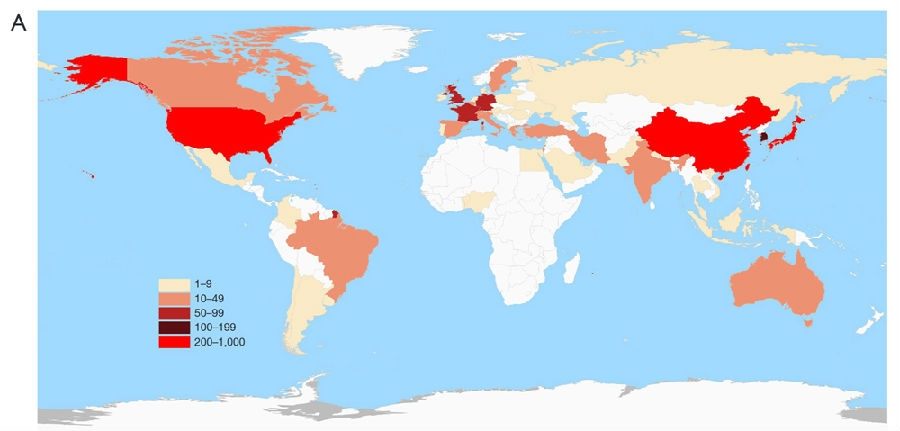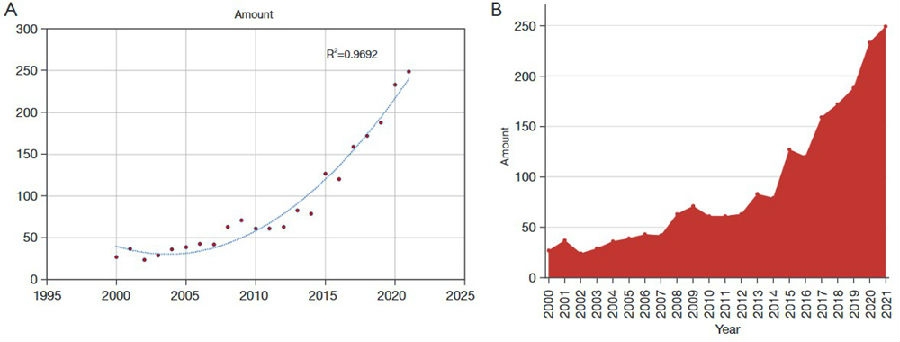 图1. 全球股骨头坏死研究论文统计(2000~2021)引自Ann Transl Med 2023, 11(3):155.)