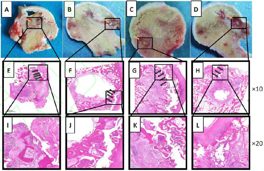A-D可见股骨头内囊性变周围出现多处头内骨折线(黄色箭头所示);E-L中苏木精-伊红病理染色可见囊性变在微观结构上会延伸出多道微骨折线(引自中国组织工程研究 2023, 27(31):4996-5001)
