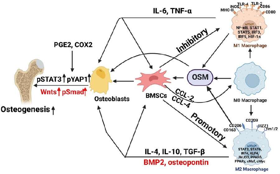 MO、MI和M2表型均通过激活抑癌素 M信号通路而有利于成骨,其中MI型巨噬细胞对骨形成的影响最大,BMSCs分泌单核细胞和巨噬细胞的主要化学诱导剂趋化因子 -2(CCL-2)和趋化因子 -4(CCL-4)