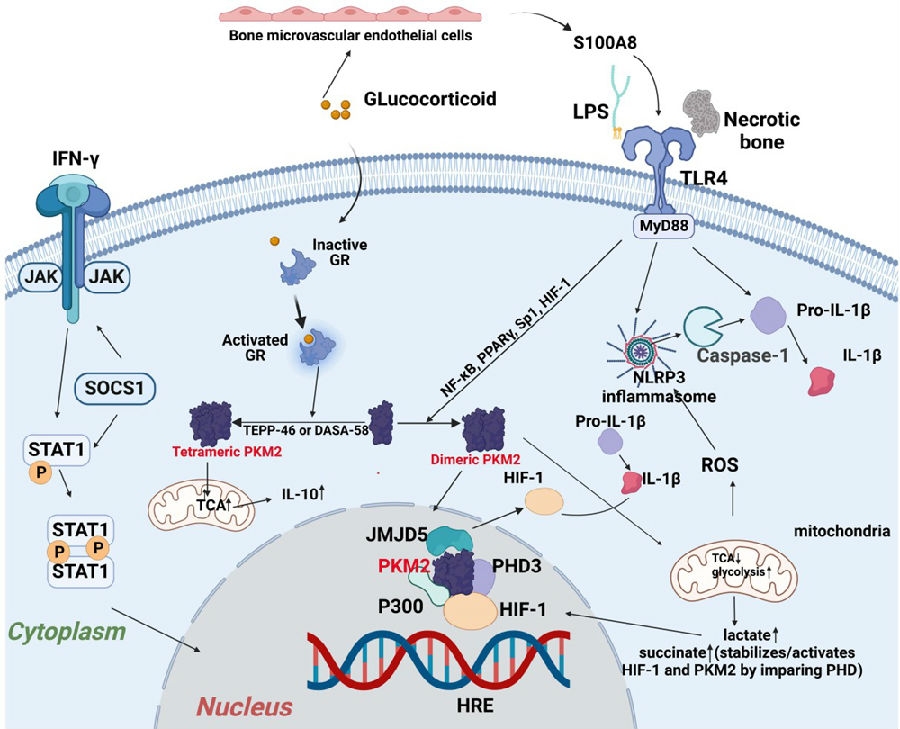 坏死组织中的损伤相关分子模式与Toll 样受体 4(Toll-like receptor 4,TLR4)结合,随后激活myd88 -细胞外调节激酶1/2 (ERK1/2)、Ik激酶(IKK) α-转录因子核因子κb途径,导致ThI细胞因子(IFN-y和TNF-a)和HIF-I的产生。IFN-y激活JAKI/2-STATI通路以及随后的STATI磷酸化也被报道与GIONFH的MI巨噬细胞极化相关类固醇相关性股骨头坏死发展过程中成骨与巨噬细胞的相关性