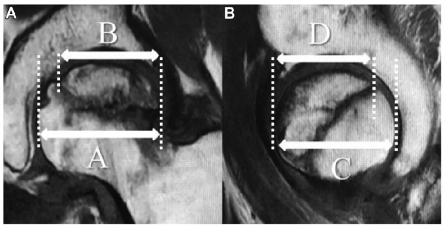 (A)利用冠状MRI上股骨头最大内外侧直径 A与坏死病灶最长内外侧长度B之比。(B)矢状面MRI上使用股骨头最大AP直径C和坏死灶最长前后长度D之比。