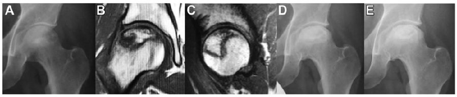 (A)第一次就诊时,42岁男性股骨头出现症状性左侧骨坏死。(B) T1磁共振成像(MRI)冠状面。(C) MRI矢状面显示62.1%股骨头前后(AP)坏死灶。(D) x线片显示首次就诊后3年的塌陷< 3mm。(E) x线片显示首次就诊5年后股骨头左侧骨坏死(ONFH)塌陷停止。