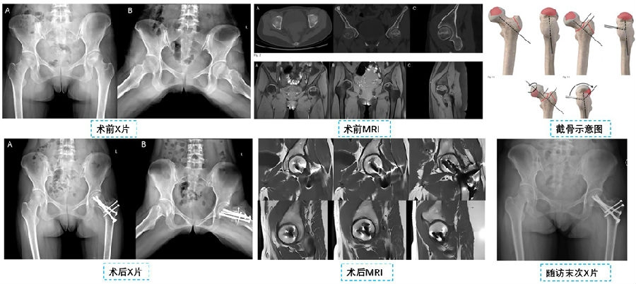2023年,解放军总医院张洪、罗殿中教授团队[19]在JBJS杂志上报道了一名股骨头坏死患者的成功保髋的病例(图10)。该患者通过股骨颈基底旋转截骨术,将股骨头的坏死区域旋转出承重区,并实现了坏死区域的完全修复。另一项研究由Edmond等人[20]进行,作者报道了一种改良的“灯泡”技术,通过股骨头-颈部交界处的窗口对股骨头进行减压,从而提供了直接进入骨坏死病变的通道。Lu等人提出了一种β-磷酸三钙生物陶瓷(β-TCP)系统 ,用于治疗ONFH,通过促进血运重建和骨再生来提高治疗效果。