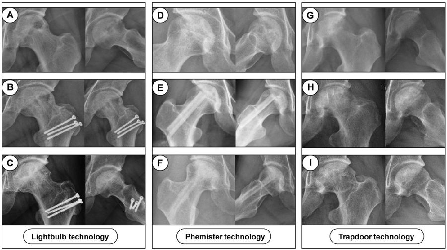 图11. 3例ONFH患者采用三种手术技术行不带血管的骨移植术