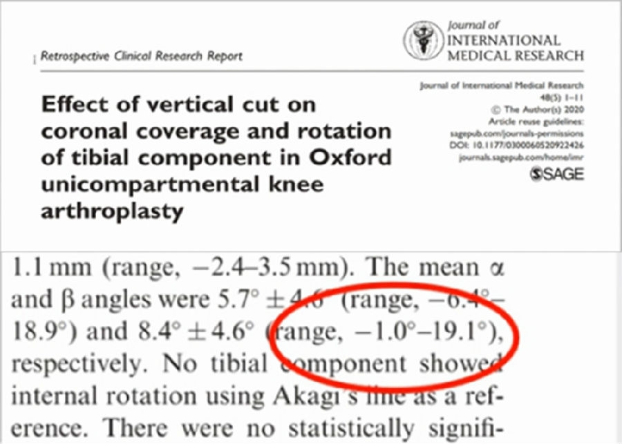 一项关于胫骨旋转的研究,通过术后CT的调研,发现胫骨平台的旋转,在使用传统MP工具的情况下,最大平衡度可以到20°左右。