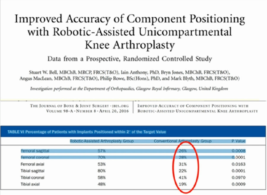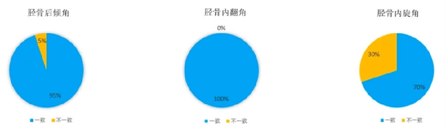 胫骨后倾角有95%的符合度,胫骨内翻角是100%的符合度;胫骨旋转仍然存在一个相对大的差距,但是比传统工具要更好,有70%的病人胫骨内旋角是在范围之内。