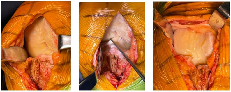 通过传统工具截股骨后髁,注意槽内截骨后手压低。用尖刀切除内侧半月板,保留1毫米残余。