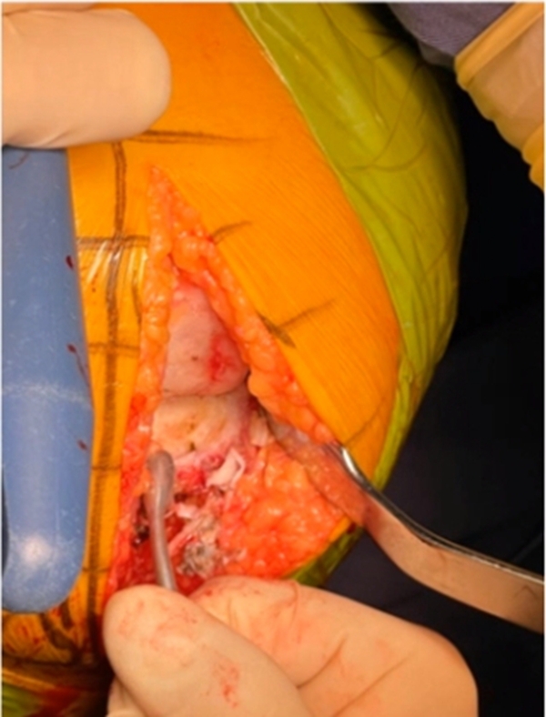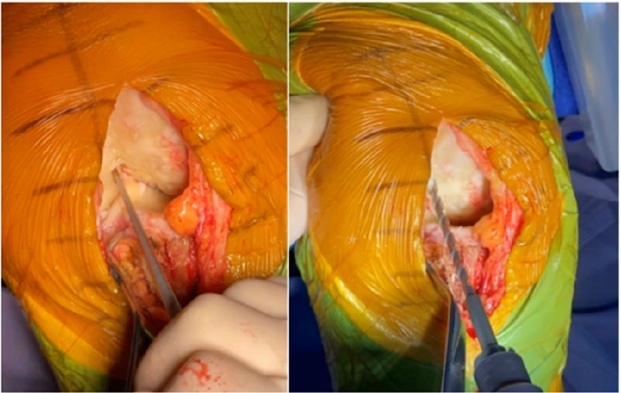此时要把股骨髁间窝外侧壁进行整个的骨赘去除,但是对于股骨内侧髁外侧壁的骨赘一定不要去除。随后常规插入髓腔杆,它主要目的是髌骨拉钩的作用,能够提高整个手术的效果。然后要剥离股骨内侧髁内上方贴附区的软组织,刮除股骨远端贴附区软骨。注意不要去除周围的骨赘,但是骨赘表面的软骨一定要去除。