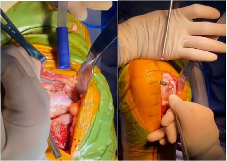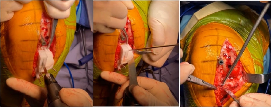 检查数据之后,进行分区截骨。垂直截骨注意避免后手抬高导致后方皮质过度切割。水平截骨在Z字拉钩保护下进行,最后截断内侧截骨槽的连接点。注意为避免锯的过程中出现震动导致的导板移位,需要在锯的过程中通过上面的按压点维持导板稳定。