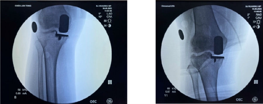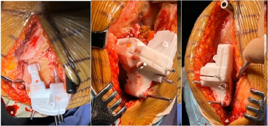 将股骨导板置于对应的贴附区,沿按压点向后、向外下按压,确认位置贴附满意。术者通过按压点确保导板贴附,助手按照导针顺序顺着导针孔的方向固定导针。注意在导针有二次阻力突破即停止。同时要从各个角度确认导板贴附准确。