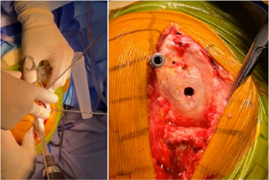 将胫骨导板置于剥离显露好的骨面,术者通过按压点向后、下、外施压,令导板与胫骨前、上和胫骨结节内侧充分贴附。按照顺序打导针,此时要注意术者按压,助手打导针,确保导针与固定孔的方向保持一致,并且导针突破二次阻力就停,不要导针过深导致后边血管神经损伤。