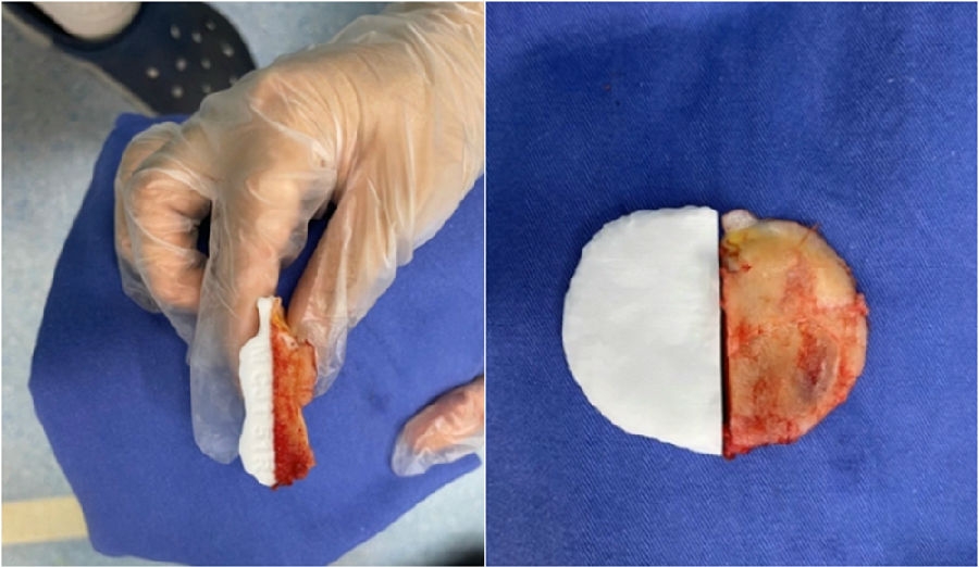取下导板,取出骨块进行比对。注意对比厚度时要加上软骨的厚度如果吻合度有明显偏差,可以考虑徒手加截。