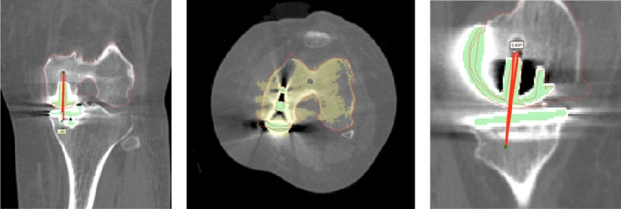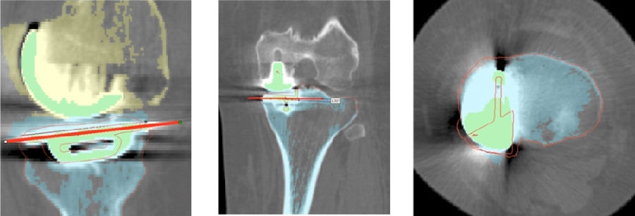 同时,笔者团队也在和导板公司进行合作,把用术后CT和术前CT进行匹配,来验证术前规划的偏离度有多少,包括胫骨后倾、冠状面内倾、轴面胫骨假体旋转、股骨在冠状面的角度、股骨在轴面上的旋转角度以及在矢状面上屈伸角度。