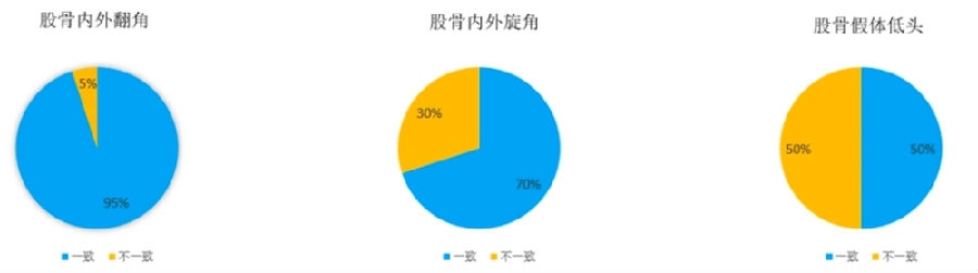股骨在冠状面的角度上也是比较好的表现,股骨内翻角存在95%的符合度,股骨内外旋转角稍差一点,但也达到70%。目前唯一还存在不太满意的地方就是矢状面上股骨假体低头,这个角度偏差度和术前规划差距较大,有50%的准确。