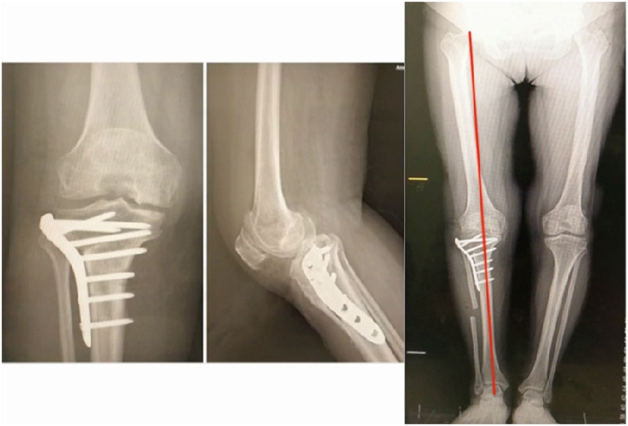 术后检查证实达到了术前预期的手术效果,关节线达到了平行,半脱位得到矫正,同时关节线和地面水平。病人行走达到了理想的效果。