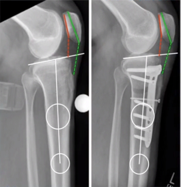 (2)上行性OWHTO可降低髌骨高度的2%-11%;当髌骨高度下降10%,可引起髌股关节压力改变,引发膝前痛。