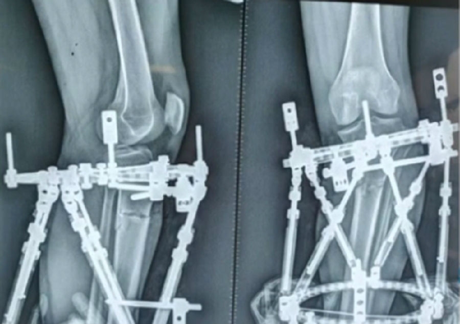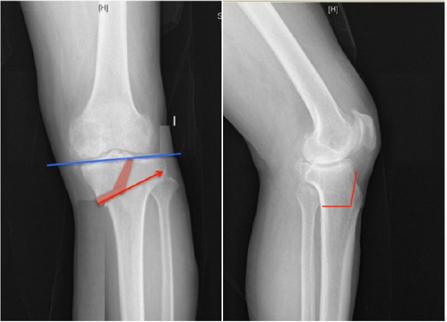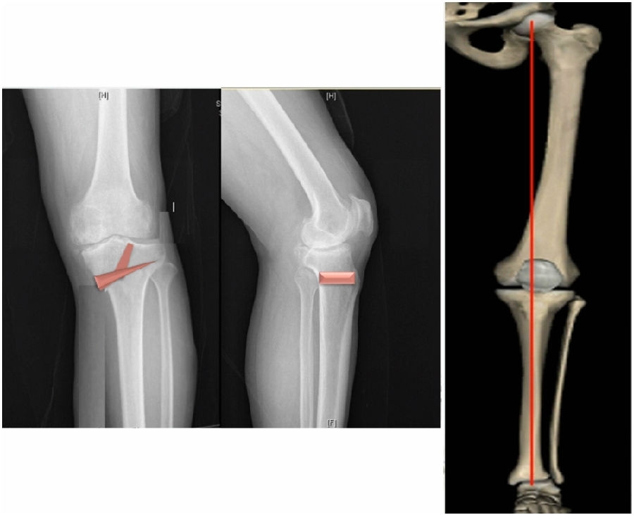 当膝关节MCOA合并旋转畸形,膝关节过伸、屈曲缩畸形,肢体短缩等复合畸形时,可以通过联合胫骨结节截骨、改变胫骨的后倾角度等矫正,但内固定矫形存在较大的局限性,可考虑外固定架。