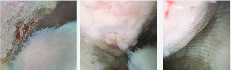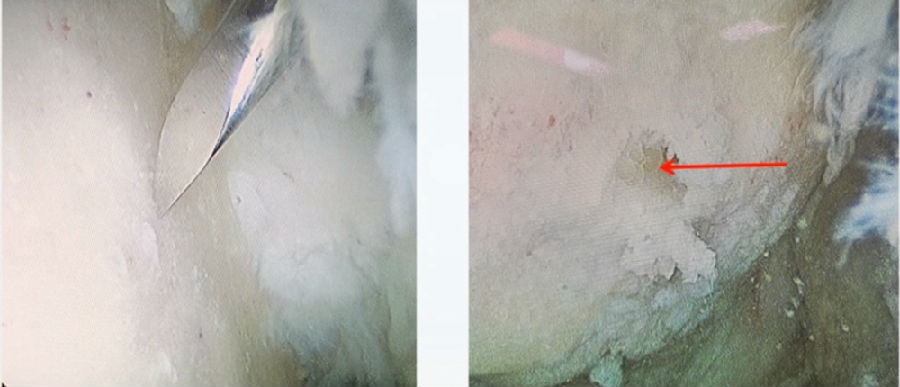 ④术中首先关节镜探查。关节镜下软骨损伤3度,软骨脱落,软骨下骨暴露。