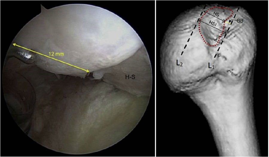 6. 巨大Hill-Sachs损伤,但肩胛盂骨缺损较小或无骨缺损,则建议术前在CT上测量HSI。如果HSI大于83%下肩胛盂直径,则应在进行Bankart修复手术后进行关节镜下的remplissage手术。